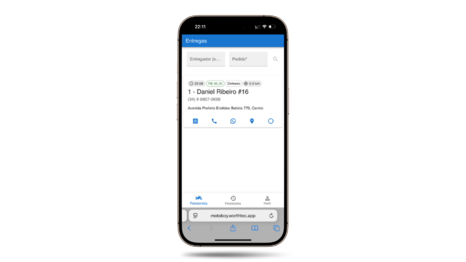 Com o sistema, você pode cadastrar seus entregadores diretamente na plataforma e disponibilizar o aplicativo para que o motoboy tenha acesso rápido aos pedidos. Ao informar o número do pedido no app, o sistema localiza automaticamente todas as informações, exibindo os dados do cliente e a rota de entrega, facilitando o deslocamento e evitando erros.